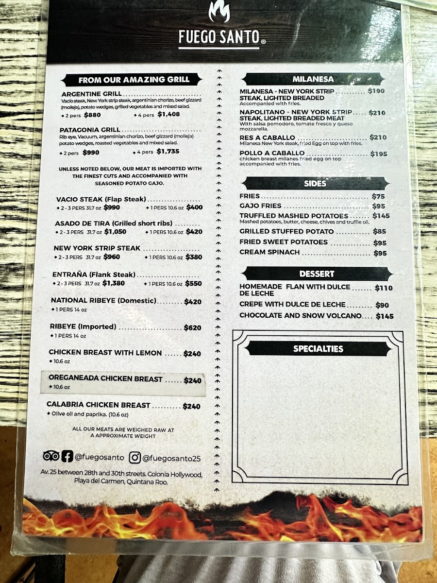 Welcome to Fuego Santo, a hidden gem nestled in the heart of Playa del Carmen. This vibrant eatery specializes in mouthwatering steaks, with customers raving about their remarkable ribeye, described as the best in town for both taste and value. Situated at 25 Avenida Nte, Fuego Santo combines a cozy ambiance with attentive service, making it an ideal spot for friends to share a memorable meal.
